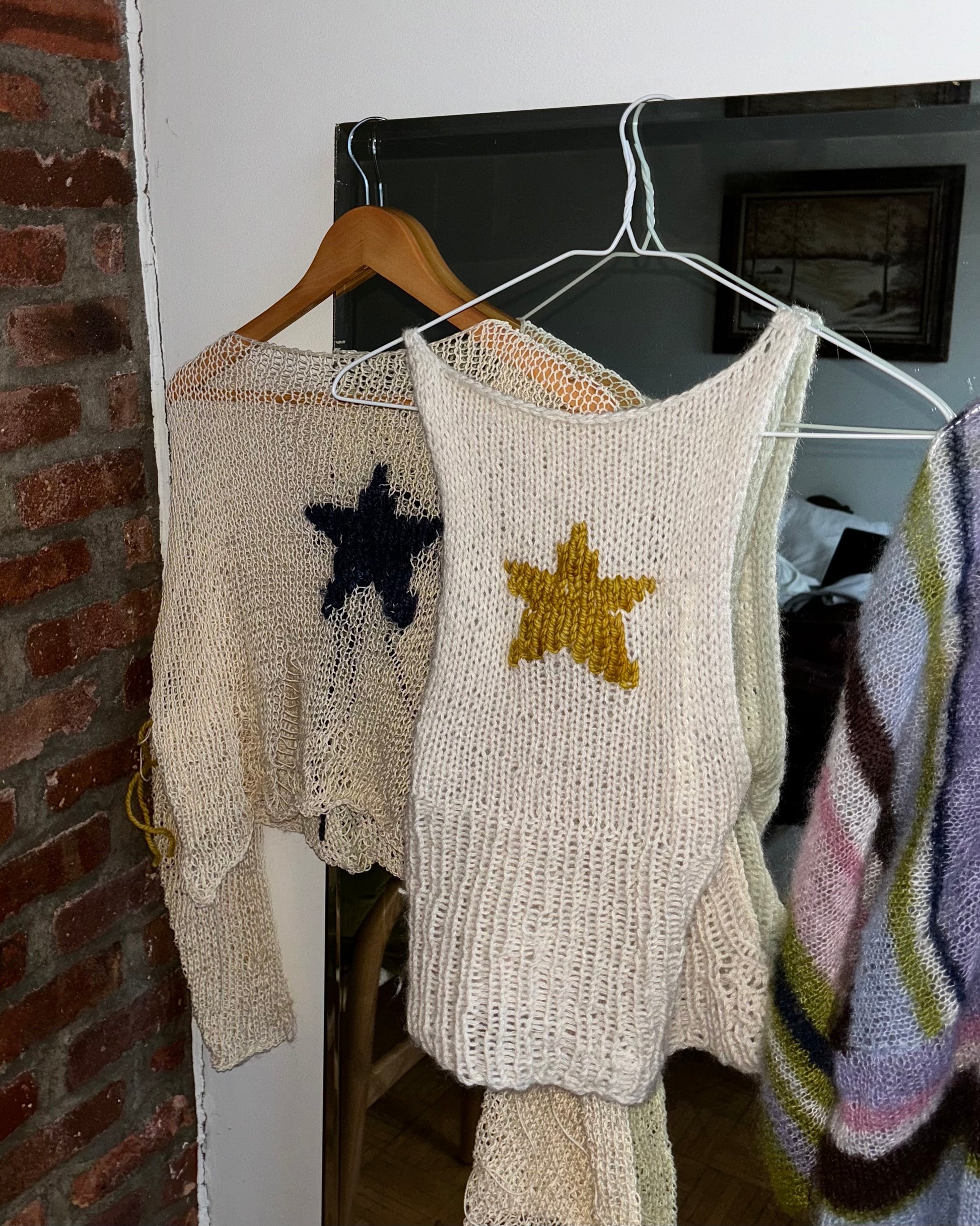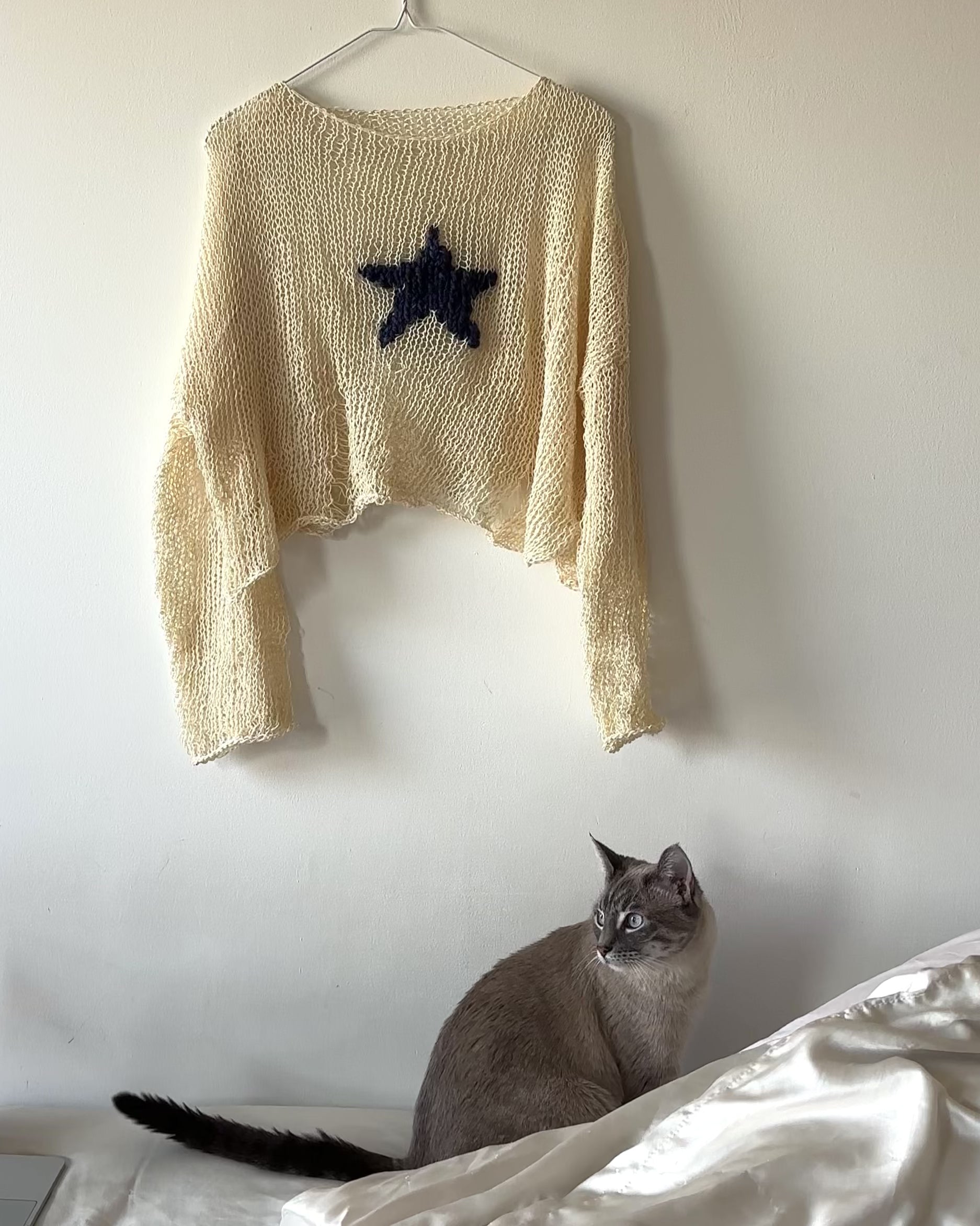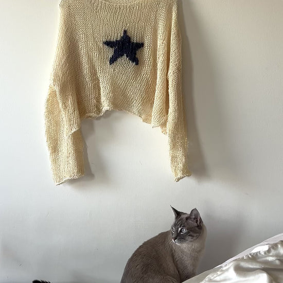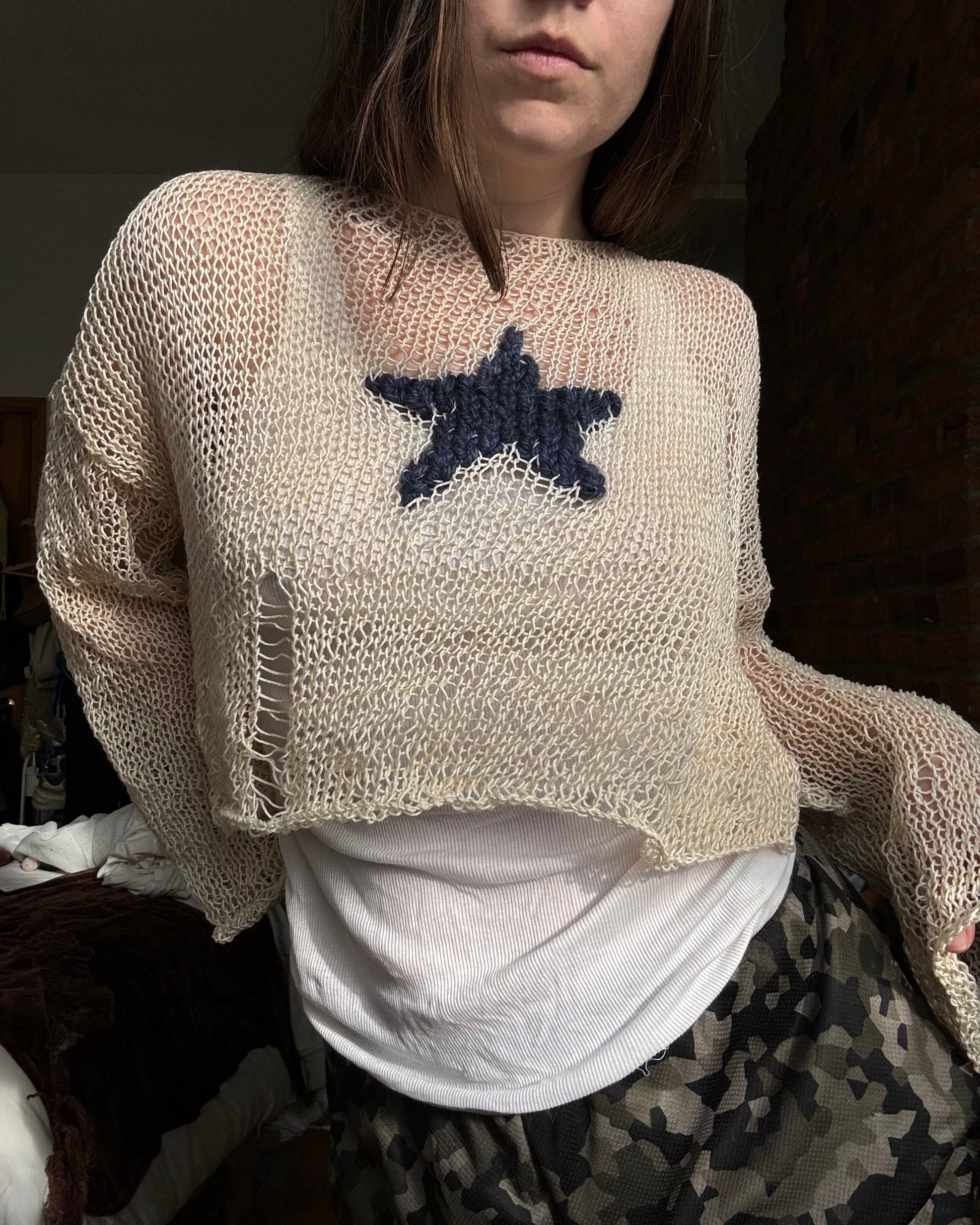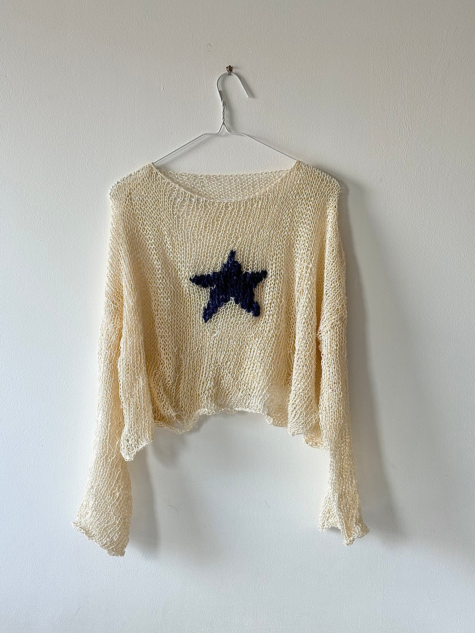 The Star Girl Pullover is a loosely knit, slightly distressed, long sleeved top that is cropped and designed to fit in an oversized and boxy manner. This piece is hand knit in 100% mercerized cotton and the star motif is knit in a navy blue yarn consisting of merino wool and mohair.