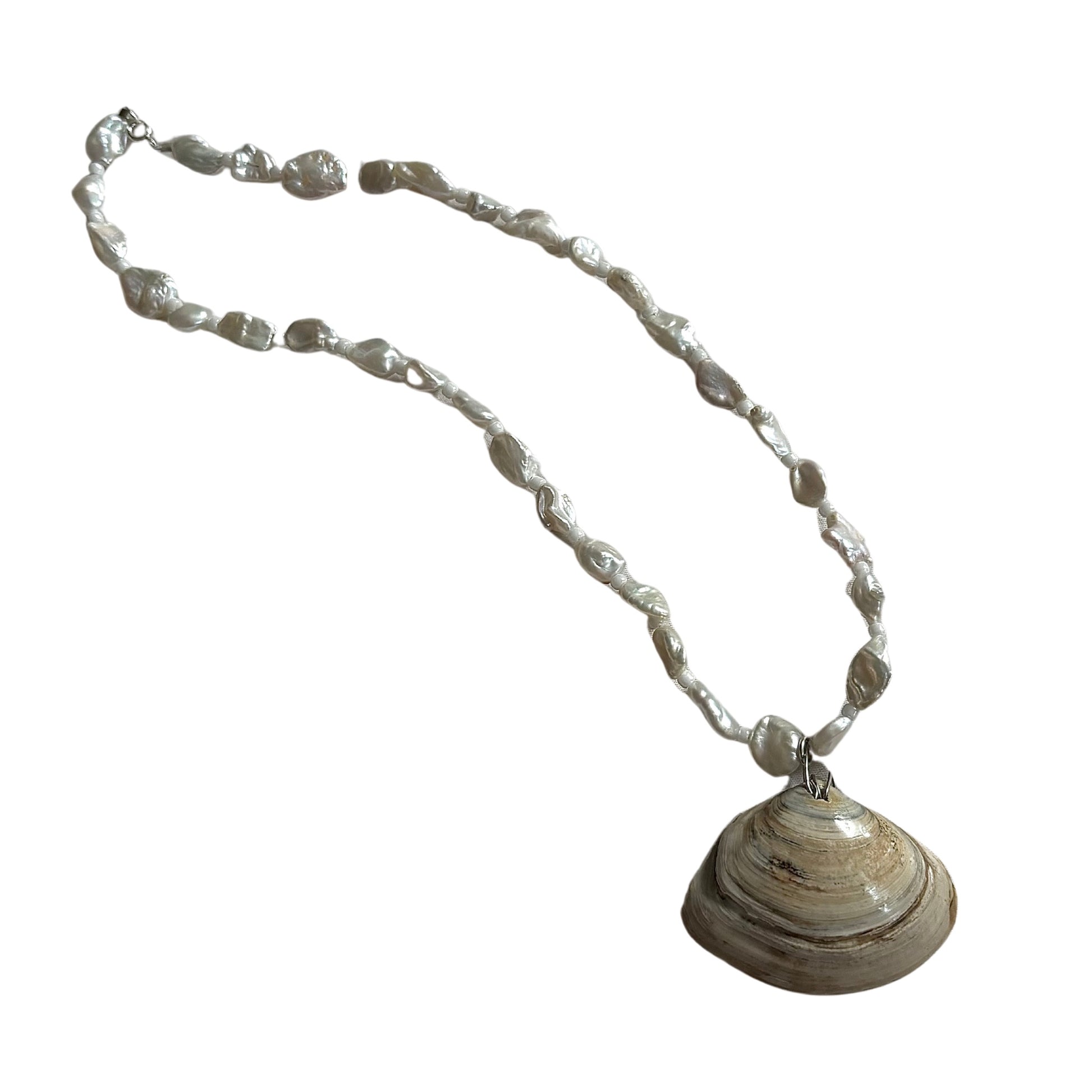 In New York, you're probably either a Rockaway or a Hamptons kind of girl. And until someone wants to let me in on their generational wealth, I'm firmly a Rockways girlie. This handmade, one of a kind necklace is inspired by the craggy jetties of the Rockaways, in Queens, New York. The clamshell pendant was found along those very shores and a kind little sea creature was the one who drilled it's hole so I could later attach it to a necklace. It also features freshwater pearls, that I did not find by hand, but are still all unique in shape while uniform in look.